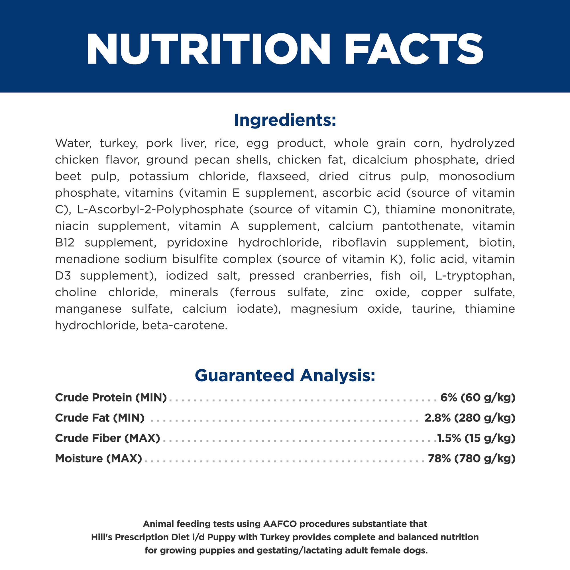Animal feeding tests using AAFCO procedures substantiate that Hill's Prescription Diet i/d Puppy with Turkey Dog Food provides complete and balanced nutrition for growing puppies and gestating or lactating adult female dogs.
