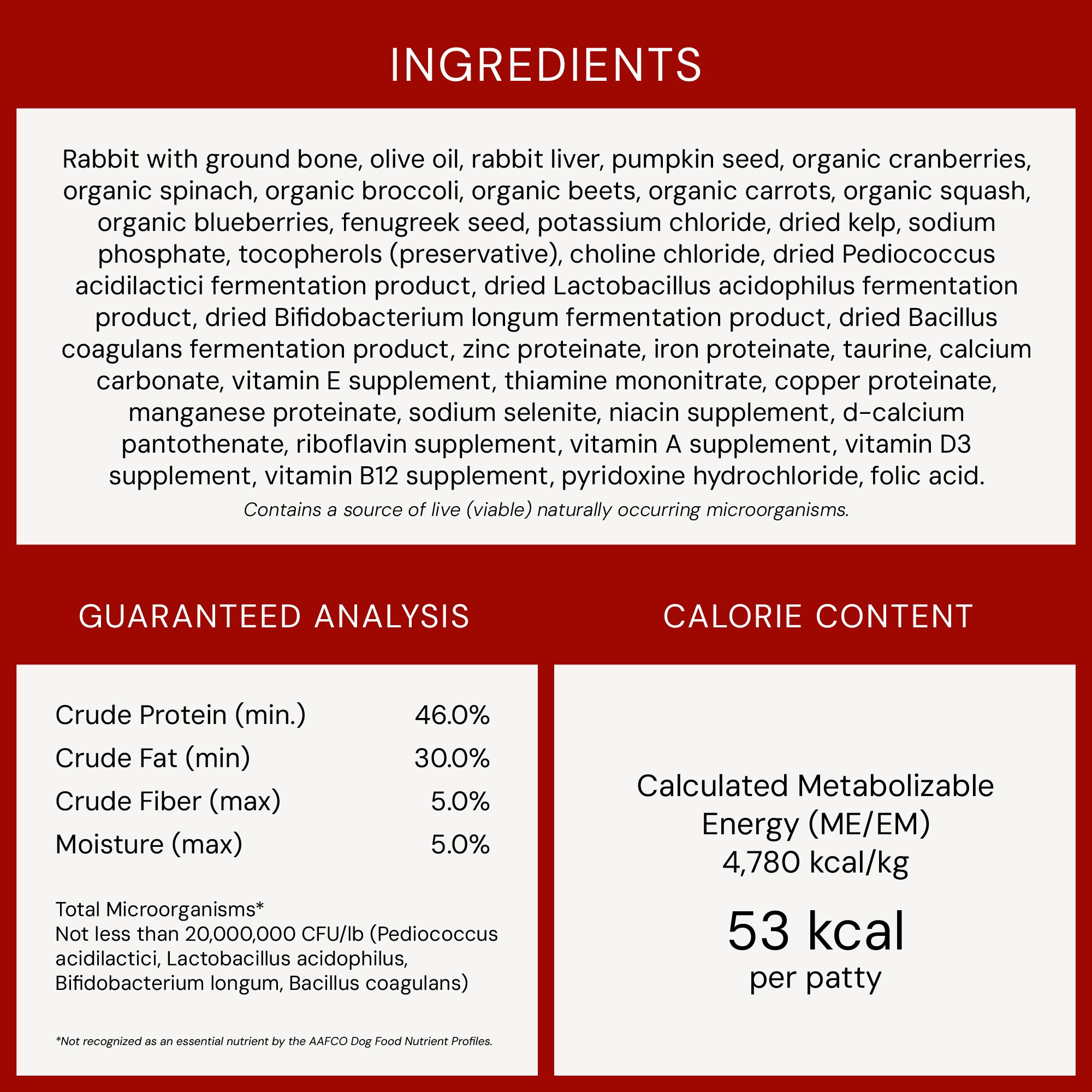 - Irresistible Taste Dogs Love! Made of 90% rabbit and bone, our farm-raised Rabbit recipe will delight your pup.