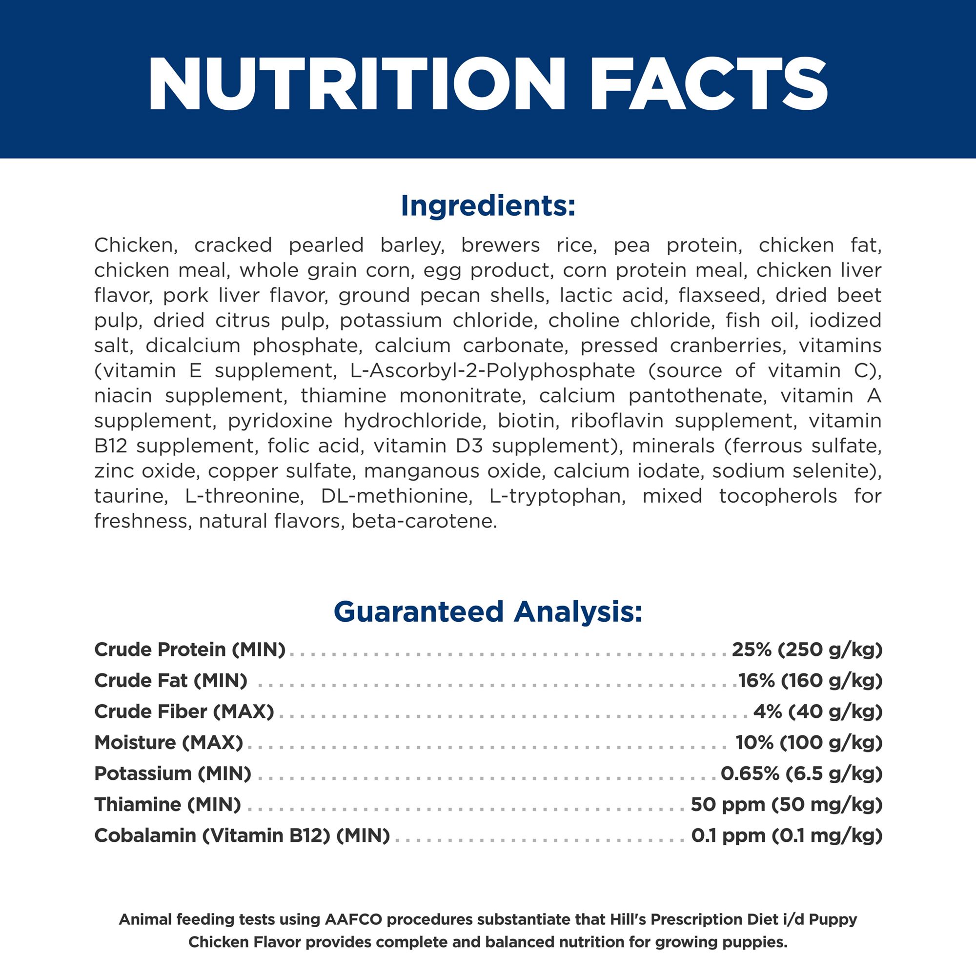 Features & Benefits: Hill's Prescription Diet i⁄d Dry Puppy Food is specially formulated by Hill's nutritionists and veterinarians to support puppies' digestive health.. Nutrition formulated to help settle digestive upsets in puppies. Highly digestible formula to support easy nutrient absorption. Made with ActivBiome+ Digestion, a proprietary blend of prebiotic fibers shown to rapidly activate the gut microbiome to support digestive health and well–being. High levels of B vitamins and added electrolytes help replace lost nutrients from digestive upset. Clinically proven antioxidants to support a healthy immune system. Omega–3 & 6 fatty acids support healthy skin and luxurious coat. Vet Recommended Nutrition, Pet Approved Taste.